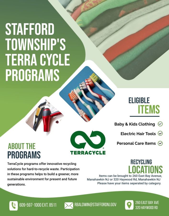 🌟 Exciting news! 🌟 Stafford Township is thrilled to offer these new recycling programs through TerraCycle, making it easier than ever for residents to recycle baby and kid clothes, personal care products, and hair care tools!🌱♻️